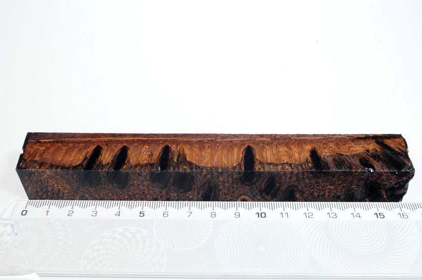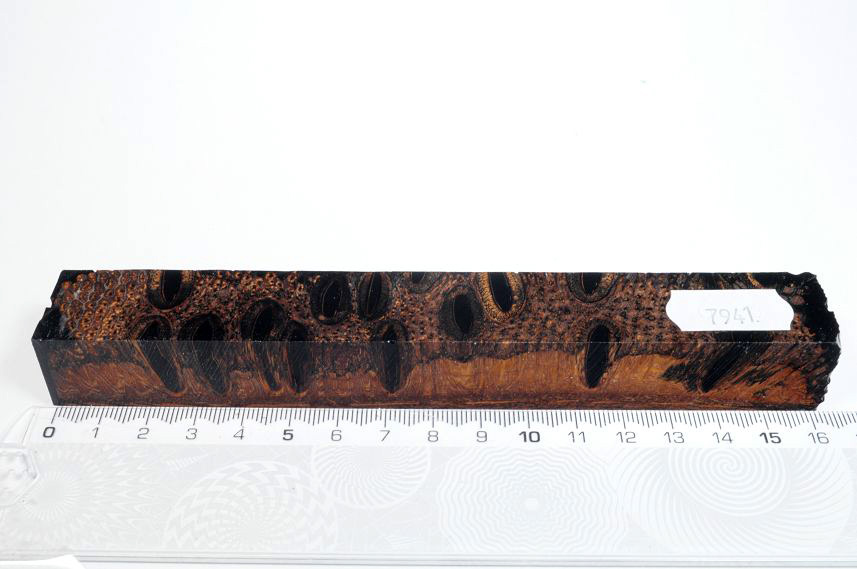 Die Samenöffnungen wurden mit gefärbtem Kunstharz unter Vakuum verfüllt und zu Pen Blanks verarbeitet