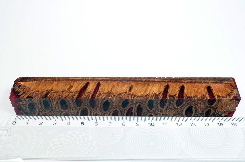 Die Samenöffnungen wurden mit gefärbtem Kunstharz unter Vakuum verfüllt und zu Pen Blanks verarbeitet