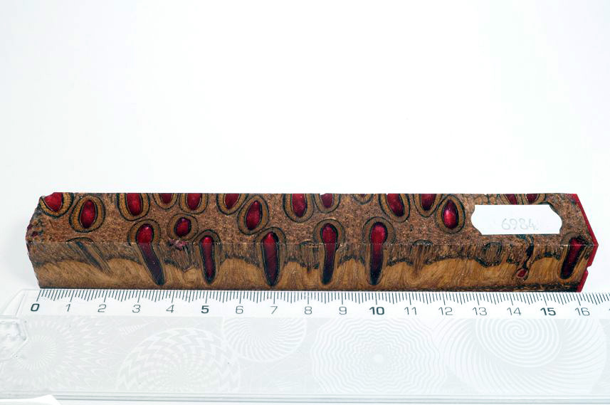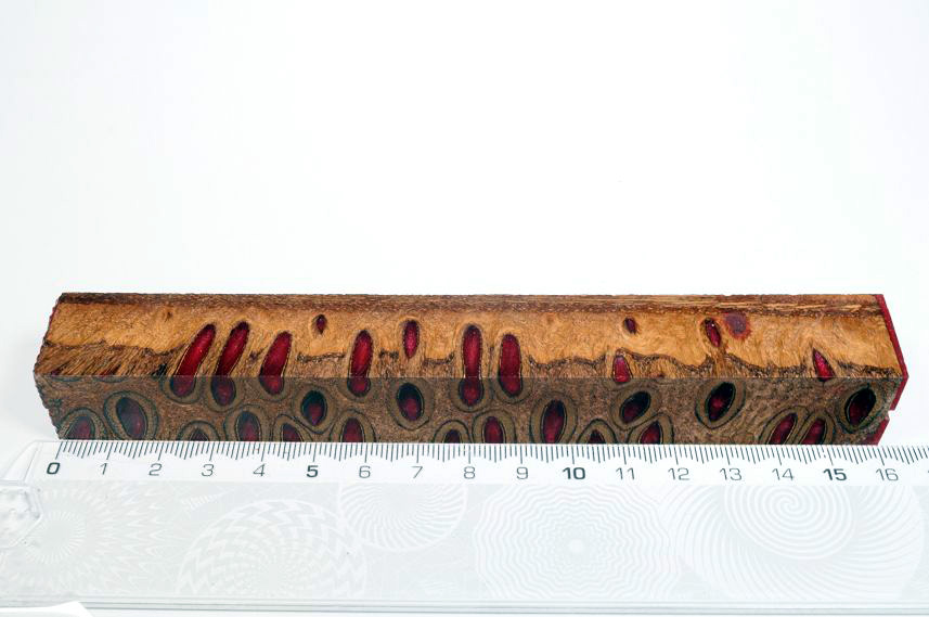 Die Samenöffnungen wurden mit gefärbtem Kunstharz unter Vakuum verfüllt und zu Pen Blanks verarbeitet