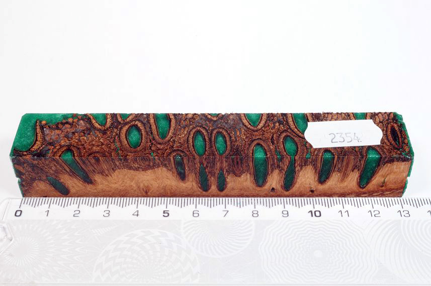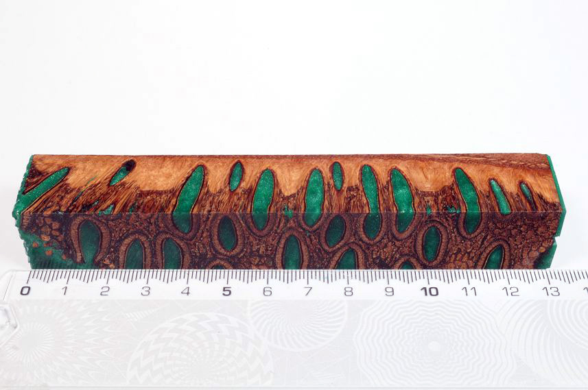 Die Samenöffnungen wurden mit gefärbtem Kunstharz unter Vakuum verfüllt und zu Pen Blanks verarbeitet
