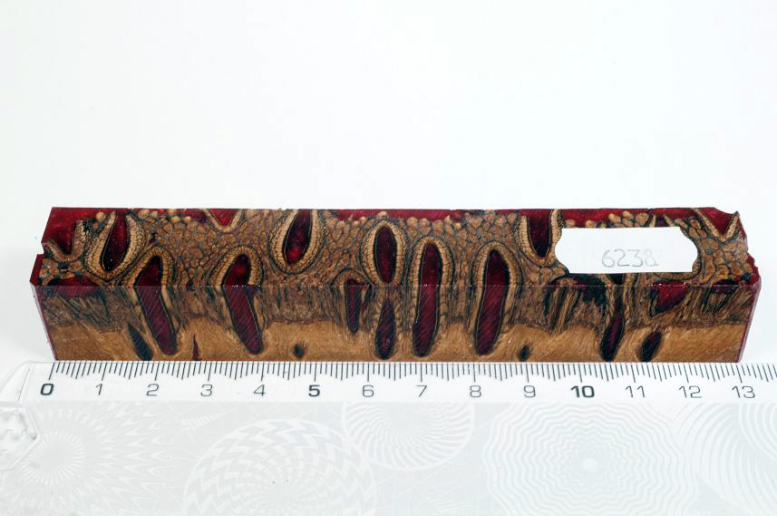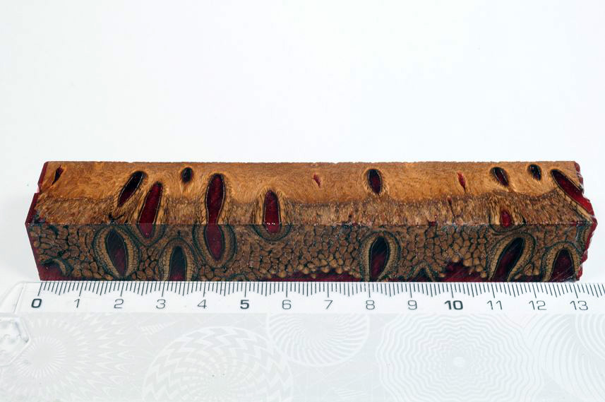 Die Samenöffnungen wurden mit gefärbtem Kunstharz unter Vakuum verfüllt und zu Pen Blanks verarbeitet